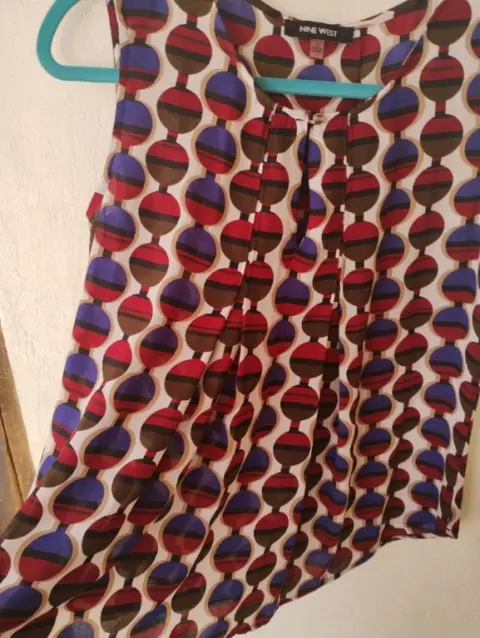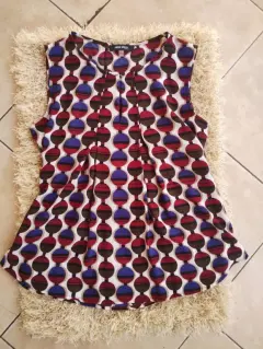 Blusa vaporosa sin mangas. Linda blusa vaporosa 100% poliéster sin manga y lindos pliegues en la parte de enfrente y atrás que realzan la figura.Diseño de círculos en colores cafe, vino y azul marino con fondo en blanco.Nueva sin etiqueta 🏷️Marca Nine West talla S mide 38 cm hombro,52 cm axila y 65 cm larga