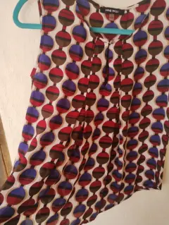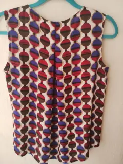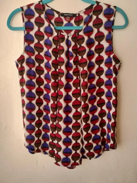 Linda blusa vaporosa 100% poliéster sin manga y lindos pliegues en la parte de enfrente y atrás que realzan la figura.Diseño de círculos en colores cafe, vino y azul marino con fondo en blanco.Nueva sin etiqueta 🏷️Marca Nine West talla S mide 38 cm hombro,52 cm axila y 65 cm larga