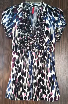 Favorecedora y cómoda blusa sin manga, con escote, con cinta para ajustar por detrás, y adorno en el área del busto. Suelta en la parte inferior. Hecha en: Vietnam. Material: 93% poliéster, 7% spandex. Colores: combinación de azul, morado, blanco y negro. Lavable en casa.