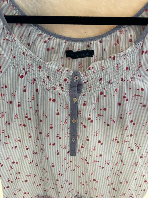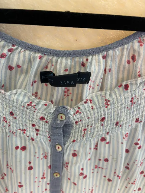 Blusa Zara azul con rojo. Color azul cielo con flores rojas Talla 30Material algodón DescripciónBlusa holgada casual color base azul claro con figuras de flores rojas resorte en el escote y en la parte de abajo manga corta con resorte al final por el frente cuatro botones con aplicación de tira color mezclilla Cuello de ojal con aplicación de tela color mezclilla Mangas cortas con resorte Estado Usado una vez Precio 200 Medidas en centímetros Ancho hombros corrido con las mangas 40 cm Busto 52 cm Largo 64!incluyendo 5 cm de aplicación de bordado color rojo en forma de triángulos Largo mangas 22 cm desde el cuello a la manga corta finaliza con resorte