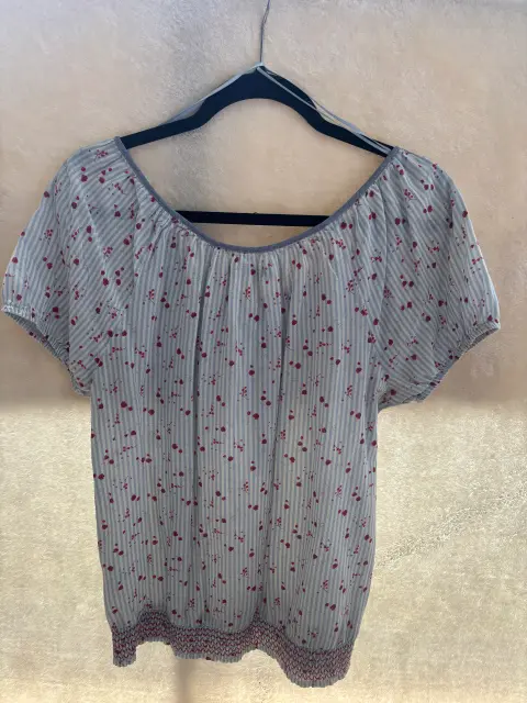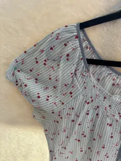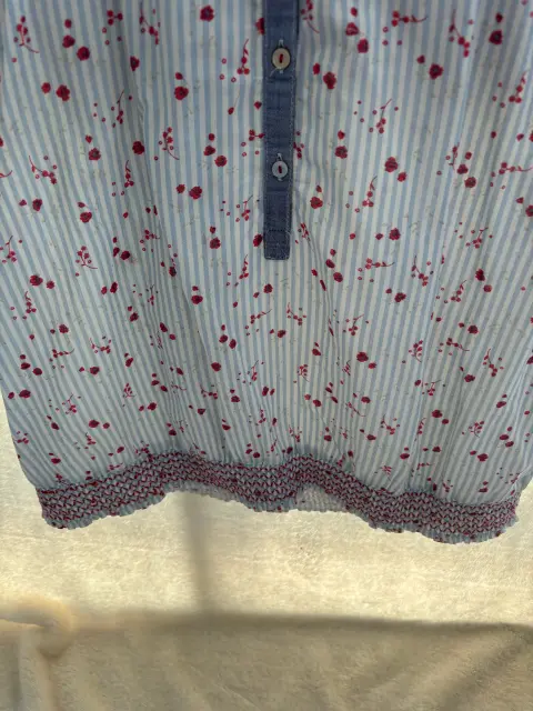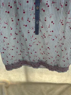 Color azul cielo con flores rojas Talla 30Material algodón DescripciónBlusa holgada casual color base azul claro con figuras de flores rojas resorte en el escote y en la parte de abajo manga corta con resorte al final por el frente cuatro botones con aplicación de tira color mezclilla Cuello de ojal con aplicación de tela color mezclilla Mangas cortas con resorte Estado Usado una vez Precio 200 Medidas en centímetros Ancho hombros corrido con las mangas 40 cm Busto 52 cm Largo 64!incluyendo 5 cm de aplicación de bordado color rojo en forma de triángulos Largo mangas 22 cm desde el cuello a la manga corta finaliza con resorte
