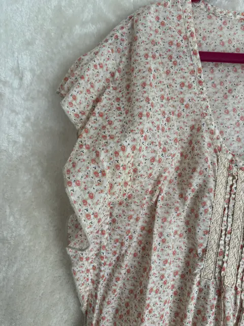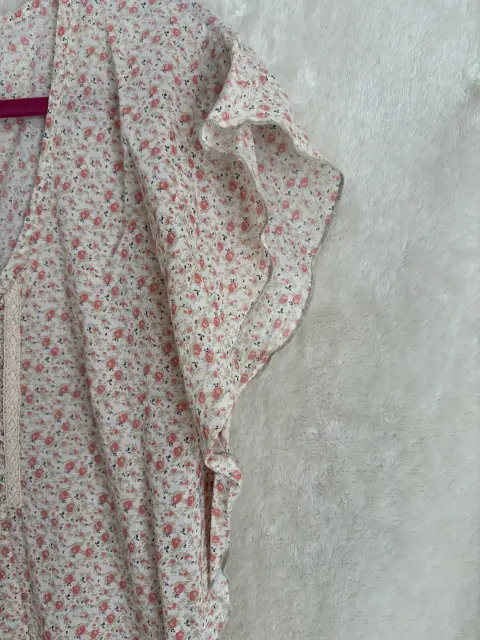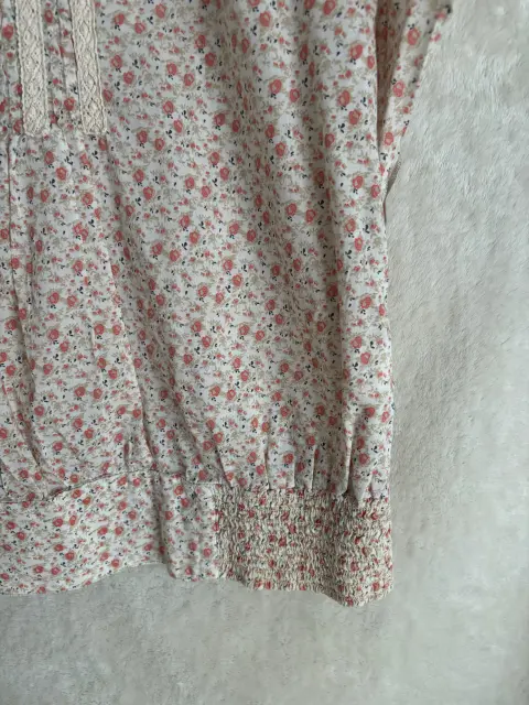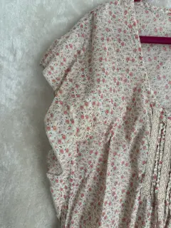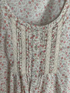 Color beige con flores ocre Talla MMaterial Algodón y poliesterDescripciónBlusa corte holgado, con resorte al final mangas cortas tipo vampiro, color base Beige con figuras de rosas rocre pequeñas , cuello redondo, con aplicación de encaje beige, 4 botones Estado Usado una vez Precio 200Medidas en centímetros Ancho hombros 48 cmCuello Redondo 26 cm Escote 20 cmBusto 50 cmLargo 65 cm Mangas cortas10 cm