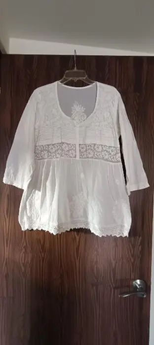 Blusón blanco con adornos bordados. Descripción y detallesBlusón blanco con bordado en frente y espalda. Talla XG. Hecho en algodón. Suelto en la parte inferior. Con manga 3/4. Fresco y cómodo.Medidas: Hombro a hombro: 45 CM. Axila a axila: 54 CM. Longitud: 75 CM.