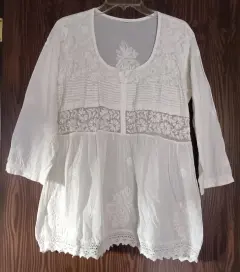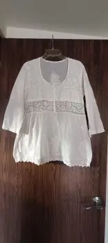 Descripción y detallesBlusón blanco con bordado en frente y espalda. Talla XG. Hecho en algodón. Suelto en la parte inferior. Con manga 3/4. Fresco y cómodo.Medidas: Hombro a hombro: 45 CM. Axila a axila: 54 CM. Longitud: 75 CM.