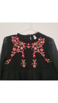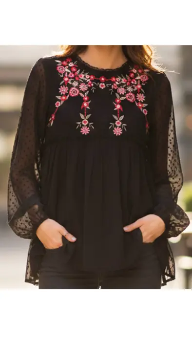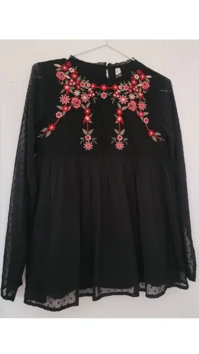 Blusón negro con flores. En perfecto estado, las mangas son transparentes y es larguito abajo de las caderas