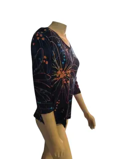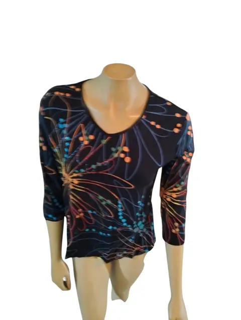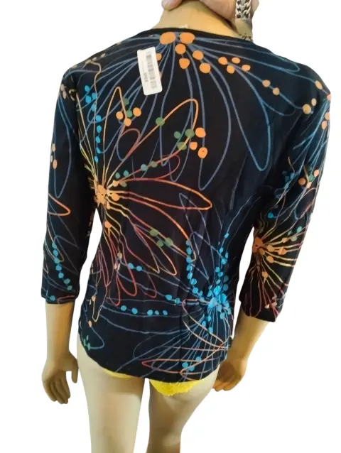 Jess & Jane Blusa Casual, talla mediana, multicolor negro azul, café, verde en graficos, cuello redondo, manga 3/4, estilo recto, hecha de algodón, mide 40cm de hombro a hombro, 50cm de axila a axila, 47cm de cintura con 58cm de largo del hombro hacia abajo, a estrenar con etiqueta en buen estado cosmético.