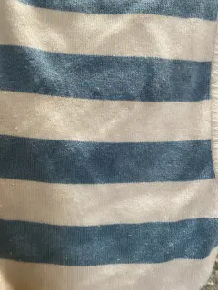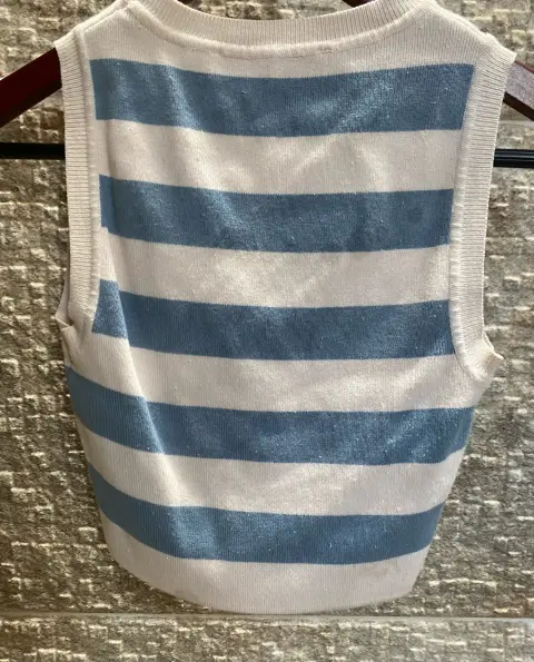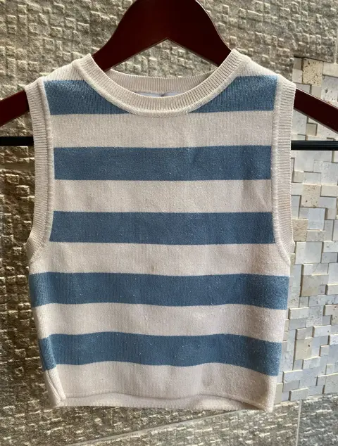 Top tejido, rayas azul cielo con blanco. Sin mangas, cómodo y fresco. Tiene detalles de uso/manchitas visibles. Ideal para uso casual o casa🩵🤍