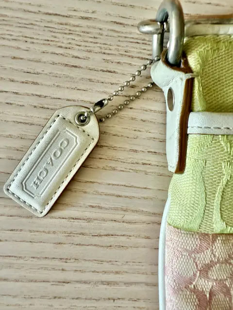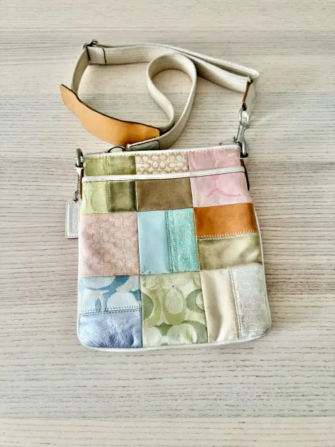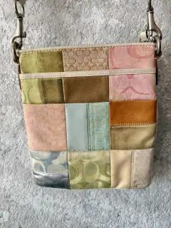 Bolsa Coach pequeña, diseño patchwork, con mezcla de telas satinadas, jacquard con logotipo “C”, gamuza, piel metálica y cuero genuino en tonos pastel; rosa, verde, azul, beige y dorado. Cada recuadro refleja la identidad de la marca con texturas y acabados únicos que aportan un toque vintage y artesanal. Falta limpieza especializada en partes de gamuza. Medidas: 22 cm alto X 20 cm ancho