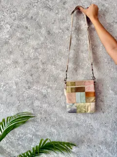 Bolsa cruzada Coach Patchwork Multicolor. Bolsa Coach pequeña, diseño patchwork, con mezcla de telas satinadas, jacquard con logotipo “C”, gamuza, piel metálica y cuero genuino en tonos pastel; rosa, verde, azul, beige y dorado. Cada recuadro refleja la identidad de la marca con texturas y acabados únicos que aportan un toque vintage y artesanal. Falta limpieza especializada en partes de gamuza. Medidas: 22 cm alto X 20 cm ancho