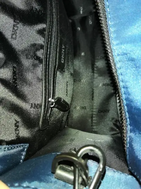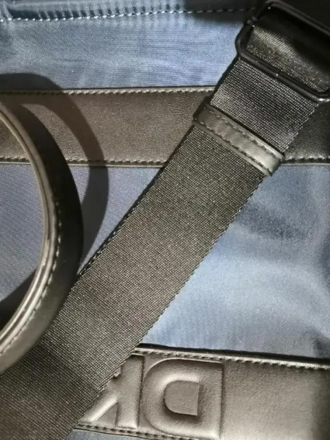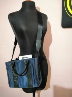 Bolsa de mano DKNY azul. Bolsa tipo tela con vinipiel, strap ajustable, cierre principal e interior, nueva sin detalles, mide 25 largo y 23 alto, tipo cuadrado