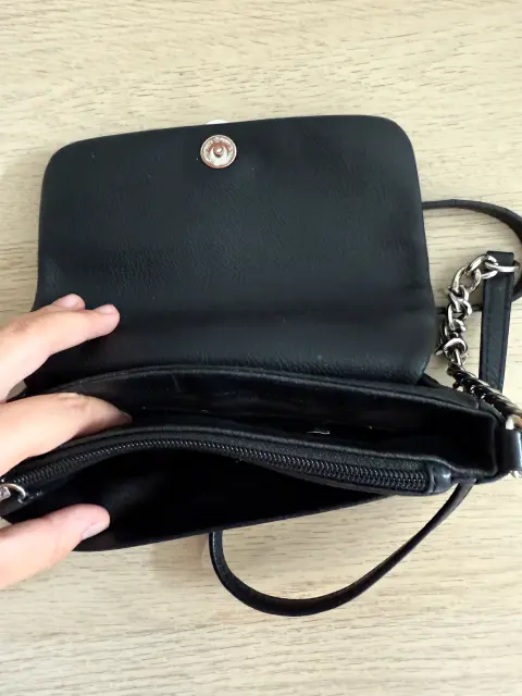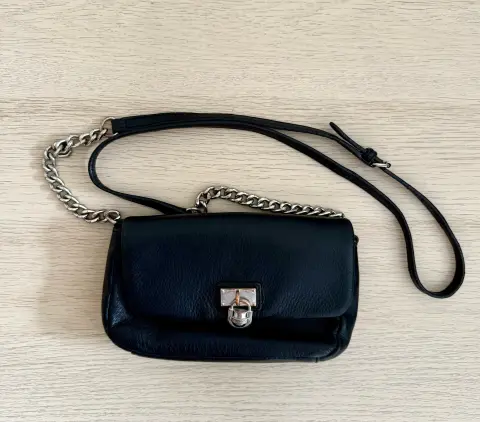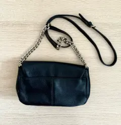 Crossbody Calvin Klein Padlock de la serie Lock Satchel Mini Diseño compacto, moderno y muy elegante de piel color negro con textura suave y broche metálico tipo candado grabado con el logo C K, Correa larga ajustable con cadena, bolsillo exterior trasero y cierre interno. Medidas aproximadas: 23 x 14 cm Condición: Muy buena. Broche con desgaste visible, sin afectar funcionalidad.