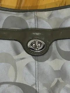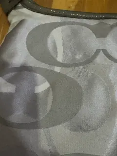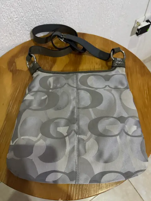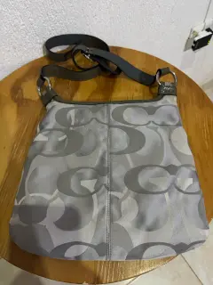 Coach mensajera signature. Edicion vintage Medida 23 x 23 cms Nada roto ni dañado Tonos grises, asa y bordes en piel satinada tipo charol.