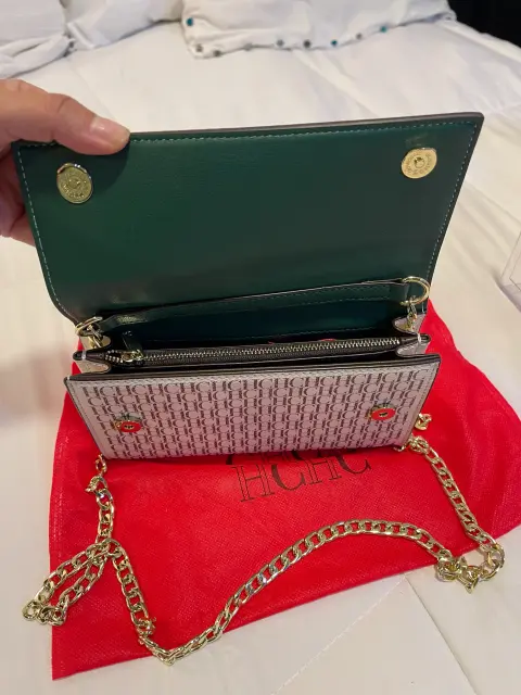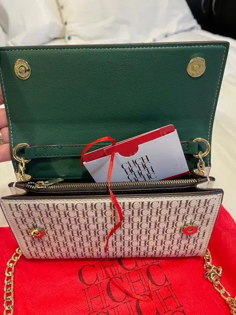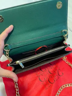 Cross body CH color beige con verde, es pequeño y cabe lo escencial
