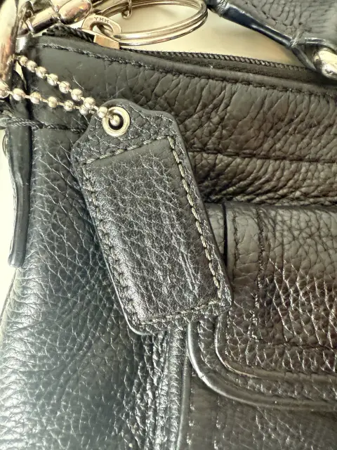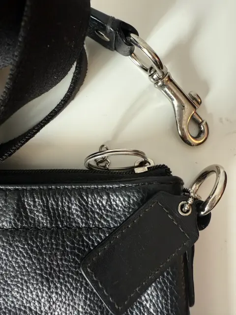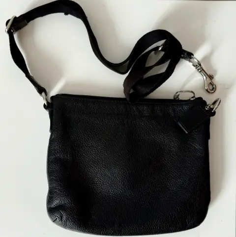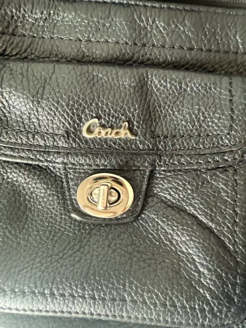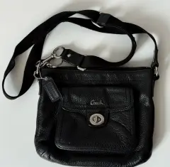 Un clásico atemporal de Coach, bolso tipo Swingpack es perfecto para quienes buscan funcionalidad, elegancia y estilo casual. Piel genuina negra,bolsillo frontal con broche giratorio turnlock y logotipo de Coach en letras metálicas plateadas, correa ajustable con detalles visibles en la última foto, incluye tag. Alto 25 cm, Ancho24 cm, Profundidad 3 a 5 cm