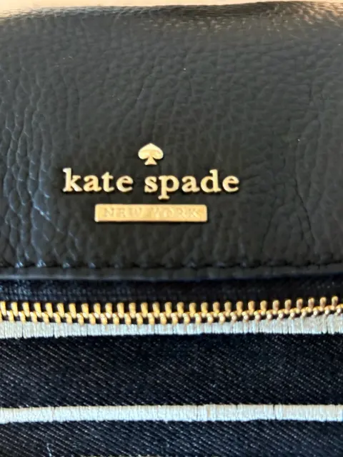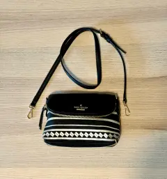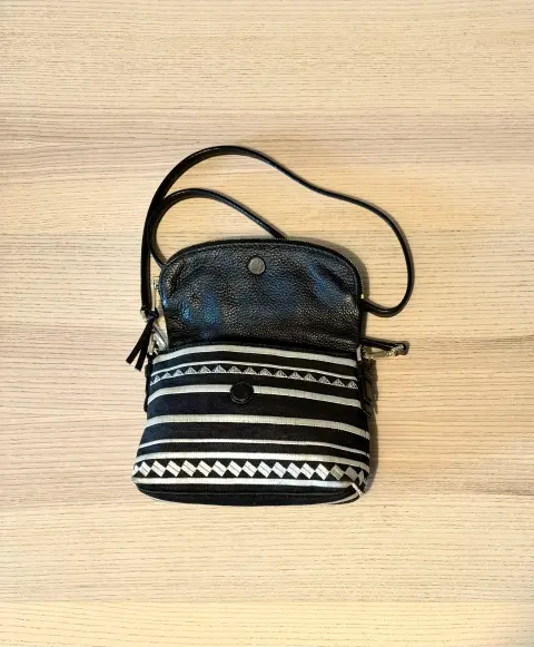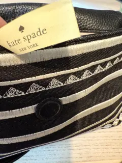 Crossbody flap bag con bolsillo exterior tipo “pouch”de piel y bordado étnico tipo geométrico Kate Spade New York, Jackson Street Gabriele. perfecta para quienes buscan elegancia con un toque bohemio, correa ajustable y removible. Estética por fuera en buen estado, forro manchado del mismo herraje. Medidas: 22 x 17 x 5.5 cm