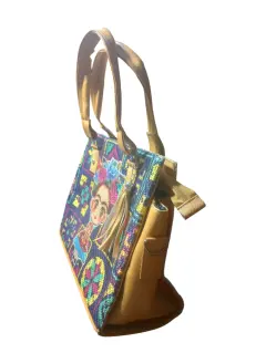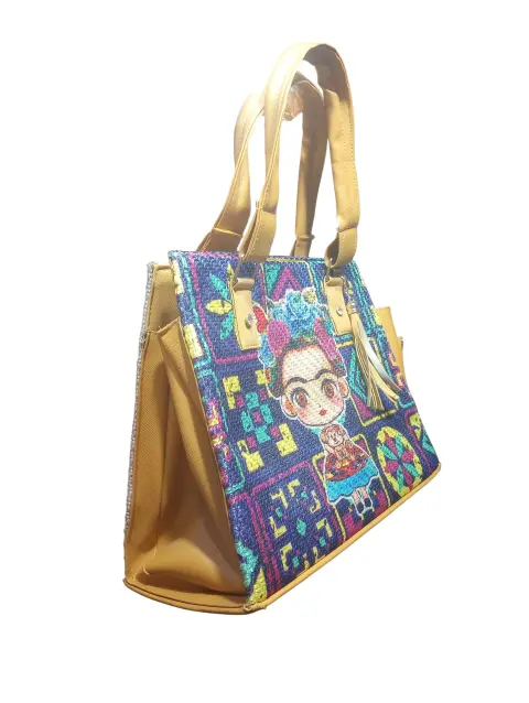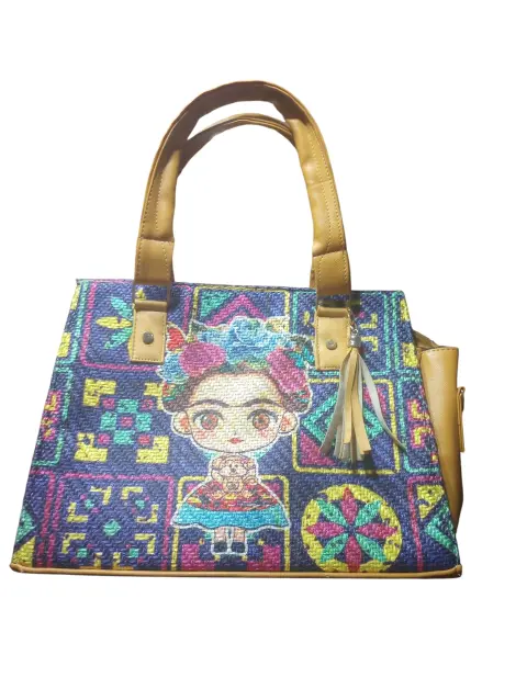 Bolsa Tipo Satchel Artesanal Caryter, multicolores con graficos de Frida Calo, artesanal, con UN bolsillo interior con cierre, hecha de material sintetico, mide 24cm de alto, 29cm, base de 14cm de ancho con correas de 27cm, Nueva a estrenar con etiqueta en buen estado cosmetico.