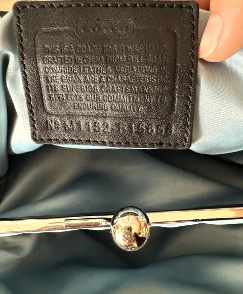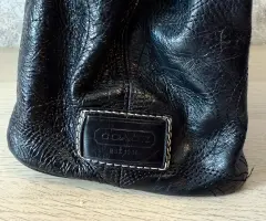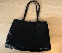 Coach Soho Black Embossed Patent Leather Tote con cierre kissloc. en piel negra texturizada con monograma grabado en relieve. Cuenta con asas largas de cuero con costura blanca decorativa, cierre principal tipo broche magnético. Medidas a32 cm alto x 37 cm ancho x 12 cm fondo Asas: 26 cm, signos de uso visibles en la parte inferior y herrajes falta limpieza en forro.