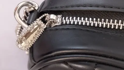 Bolso acolchado, con correa al hombro combinada con cadena una division interior, y placa, con cierre en la parte de arriba incluye certificado cubre polvo y caja. Es vegana.