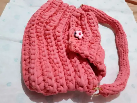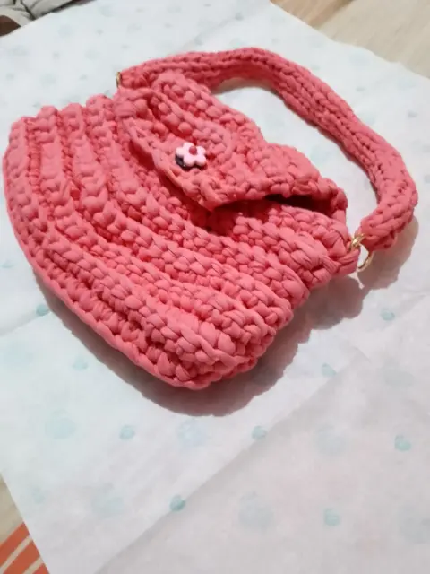 Bolsa de mano con botón de florecita, tejido a crochet con trapillo ligero, medidas 29x16x3 cmEnvio a la brevedadTodas las compras incluyen obsequioacepto ofertas