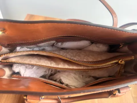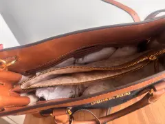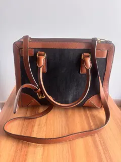 • Marca: Michael Kors (auténtico) • Material: Mezclilla azul oscuro con detalles en piel color café • Herrajes: Metálicos en dorado, incluye colgante MK distintivo • Diseño: Asa doble con opción de correa larga desmontable (si la tienes) • Color: Azul oscuro / Café • Estilo: Tote mediano, ideal para uso diario o casual chic • Interior: Amplio con compartimentosMedidas: 30x24