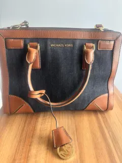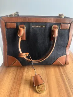 Bolso Michael Kors en mezclilla y piel café. • Marca: Michael Kors (auténtico) • Material: Mezclilla azul oscuro con detalles en piel color café • Herrajes: Metálicos en dorado, incluye colgante MK distintivo • Diseño: Asa doble con opción de correa larga desmontable (si la tienes) • Color: Azul oscuro / Café • Estilo: Tote mediano, ideal para uso diario o casual chic • Interior: Amplio con compartimentosMedidas: 30x24