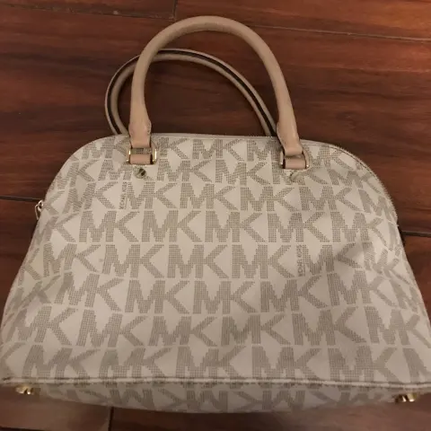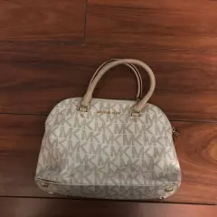 Michael Kors bolsa blanca. Michael Kors bolsa blanca con logos beige, tiene poco uso es tipo sachet, tiene bolsa interna con cierre y dos compartimentos