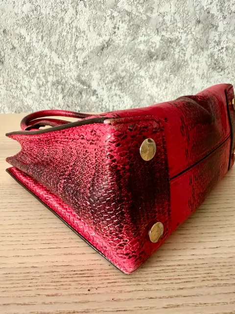 Mercer Medium de Michael Kors, Mini Tote elaborado en 100% piel de pitón auténtica, con un impactante acabado en tonos rojo y negro, que resalta su textura natural y patrón exótico. Precio E.U 11 mil pesos, es línea butique una pieza de colección, no tiene strap, desgaste en esquina como se muestra en foto, forro textil, pieza exclusiva y de colección.