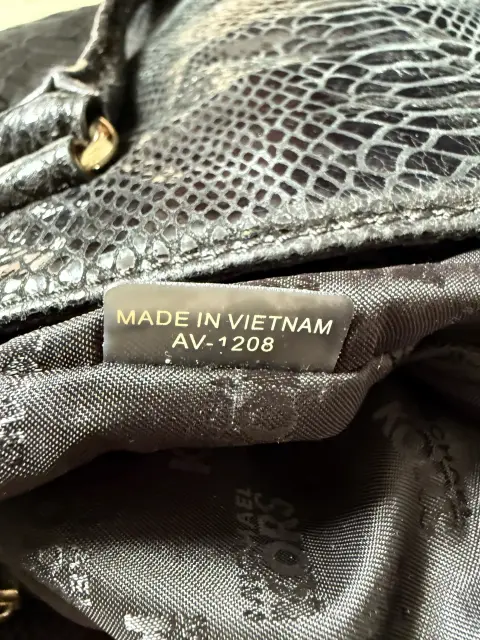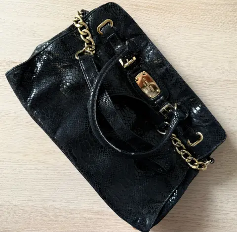 Elegancia que nunca pasa de moda! Bolsa Michael Kors modelo Hamilton, con textura tipo piel de serpiente de gamuza y charol herrajes dorados, doble asa y correa larga con cadena, es ideal para llevarla cruzada o al hombro. Interior forrado con logo de la marca, y placa dorada con el grabado “Michael Kors Est. 1981”. 32 cm x 24 cm x 13 cm Una asa presenta raspadura, no rota.