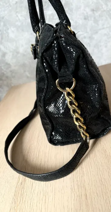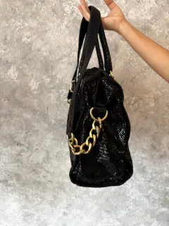 Bolso Michael Kors Hamilton Satchel. Elegancia que nunca pasa de moda! Bolsa Michael Kors modelo Hamilton, con textura tipo piel de serpiente de gamuza y charol herrajes dorados, doble asa y correa larga con cadena, es ideal para llevarla cruzada o al hombro. Interior forrado con logo de la marca, y placa dorada con el grabado “Michael Kors Est. 1981”. 32 cm x 24 cm x 13 cm Una asa presenta raspadura, no rota.