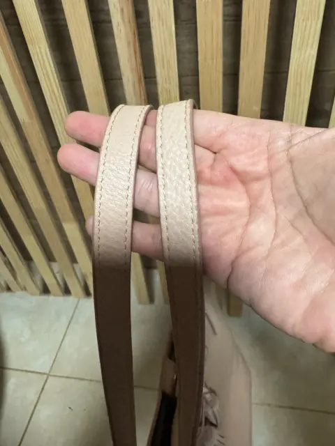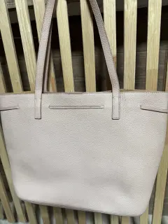 En tono rosa palo, o rosa baby, diseño elegante con el logo discreto Hecha en piel, y asas largas para llevar cómoda al hombro.