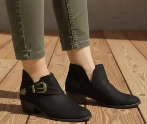 Botín hermoso diseño descubierto de ebilla, suela cómoda y ligera. Textura gamuza suave tipo piel de durazno Color negro. Fácil meter . Mexicano número #24cm. Pregunta o visita mi espacio para más modelos y numeración.