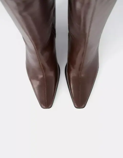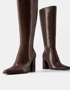 Bota alta Bershka color chocolate, acabado tipo piel, con tacón ancho de 8.5 cm y diseño limpio y elegante.