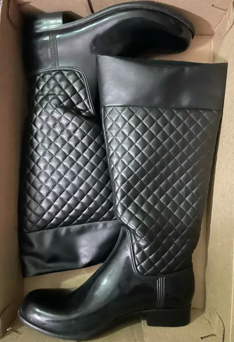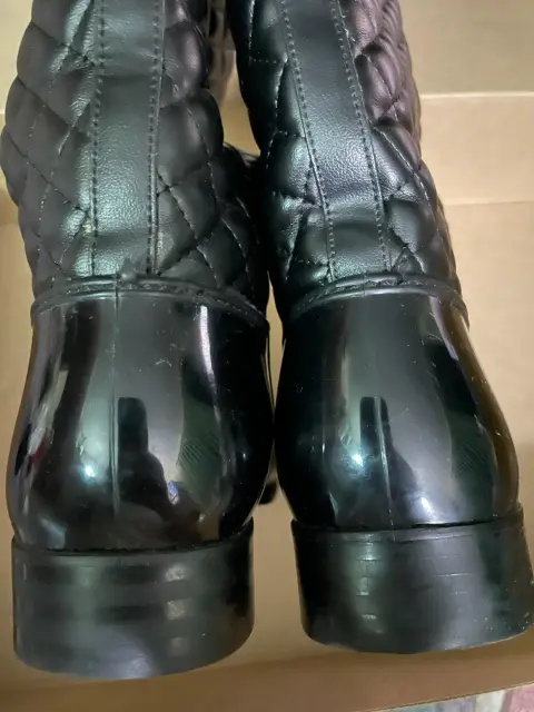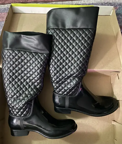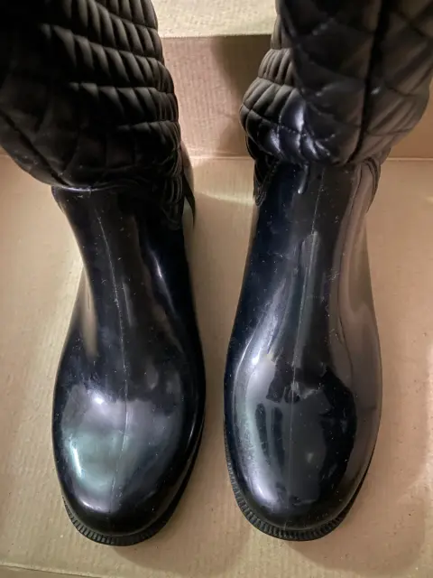 Botas negras para lluvia. Con forro suave en el interior. Alto tacón 2.5 cms, alto total 38 cms. Usadas un par de veces. Están en perfecto estado. Núm. 24. Se envían en caja original.