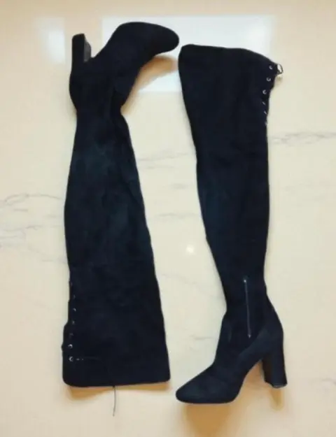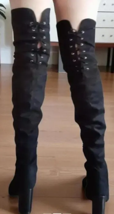 Botas Westies de tela en acabado tipo gamuza, color negro, talla 3 MX, estilo “over the knee” llegan por arriba de la rodilla a media pierna, tienen jaretas para ajustarlas o aflojarlas, cierre interno para colocarlas fácilmente, tacón grueso de 8cm, son súper cómodas, sin detalles visibles