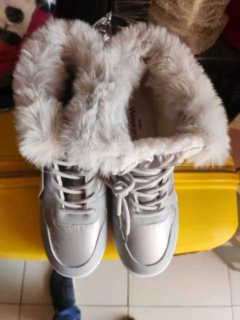 Botines de invierno Weekend. Botines de invierno Weekend, talla 25, color gris con Fondo blancoen peluche y agujetas Blancas, con plataforma corrida de 3cm de alto, Punta de almendra, hechos con material sintetico, nuevas a estrenar