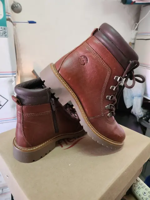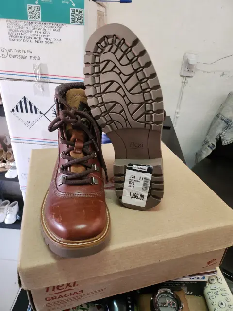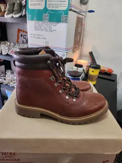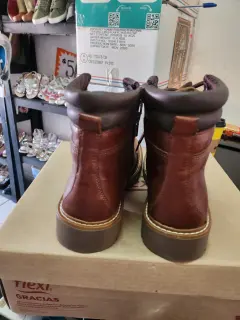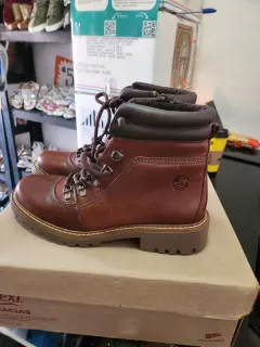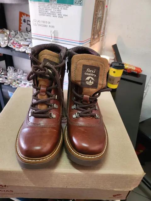 Botines Casual Flexy Country talla 25 regular, color cafe y tan, agujetas p/cierre, hecho con piel vacuna y materiales sinteticos con acento outdoor, plantilla semi-acochada y suela antiderrapante con 3.7cm de alto, nuevos a estrenar con etiqueta en buen estado cosmetico.