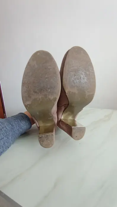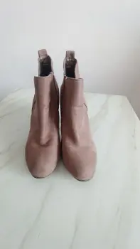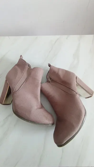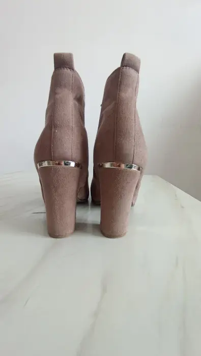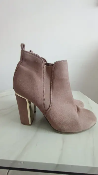 Botines de punta redonda, color tal cual se ve en las fotos, son tipo ante. Tiene detalle metálico en dorado en el tacón, tacón de 9cm. Con elástico en buenas condiciones. Marca Yaeli Fashion, talla 23. Precio $100 pesos