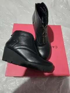 Botines tono negro, alto 6.5 cm, una puesta sin detalles, ajusta con el cierre, interior acolchado, confortables