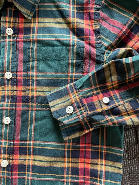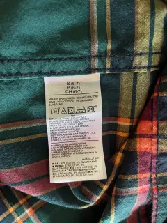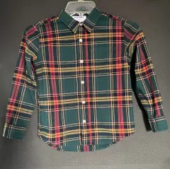 Old Navy camisa de niño verde con líneas que forman cuadros en amarillo y rojo. Talla: S (6-7)Color: verde/rojo/amarilloMaterial: 97% algodón y 3% spandex Cuidado: lavar en máquina Medidas: ancho de sisa a sisa: 38 cm, largo desde hombro hasta abajo: 49 cm