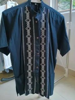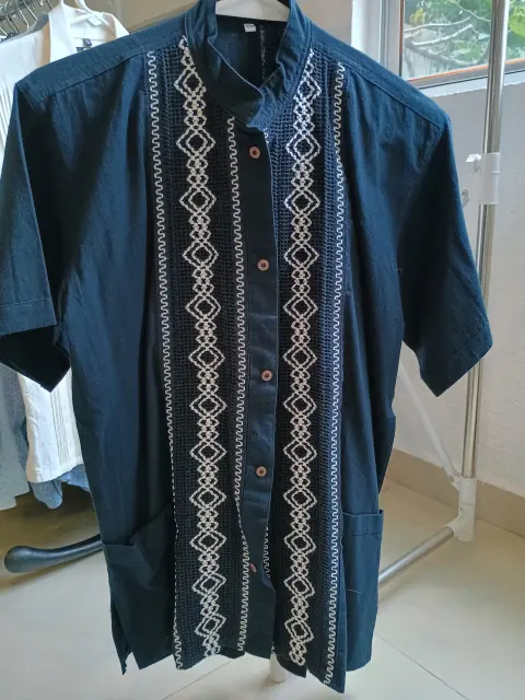 Camisa azul marino de algodón talla Chica/S manga corta con bolsas detalles bordados muy elegantes, te la puedes llevar a una boda