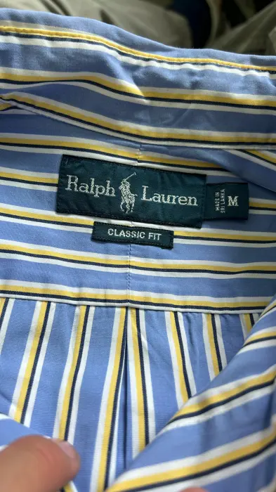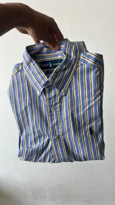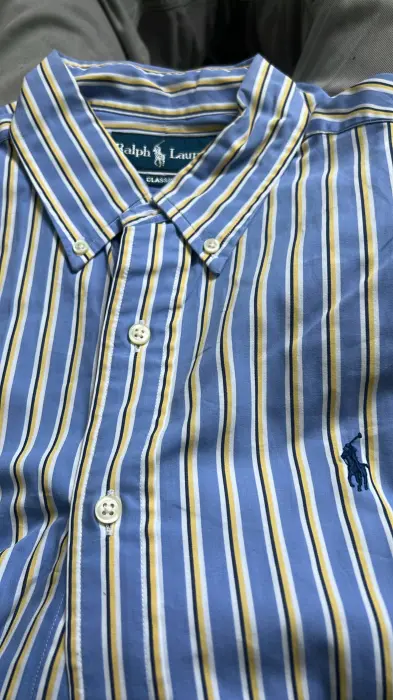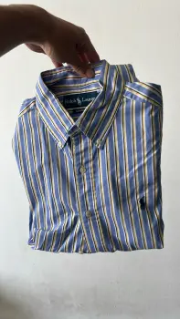 Camisa Ralph Lauren. Camisa Ralph Lauren Azul con patron se lines blancas con amarillo.Clasic fit- talla M
