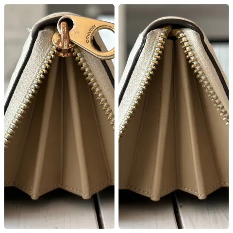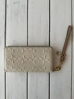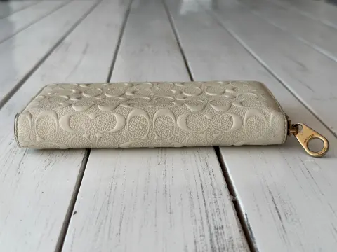 Cartera beige Coach. Cartera beige de piel con muchos espacios para billetes, 12 para tarjetas y monedero. Incluye ambas correas para la muñeca. Detalles se ven en fotos. Medidas: 19 cm x 10 cm x 2.5 cm