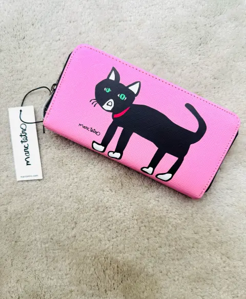 Cartera gatito NUEVA!!. También los accesorios son parte esencial del estilo!! NUEVA!! Bonita cartera en color amarillo con figura de gato de ojos azules en uno de los lados del diseñador Marc Tetro que hace estos accesorios con imágenes de perros y gatos. Piel vegana. No mascotas y no humedad. Más opciones en mi closet. Ideal para regalo. El diseñador neoyorquino solo hace gráficos de animales de compañía.