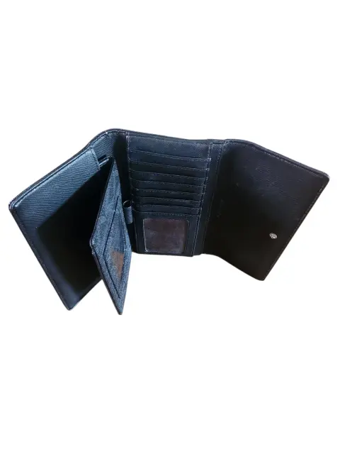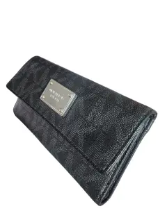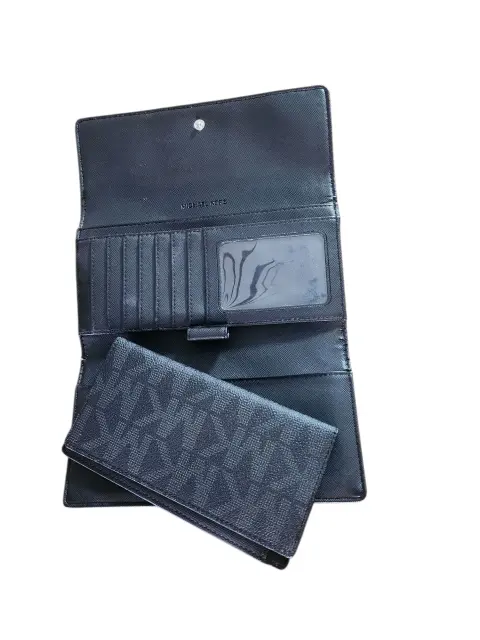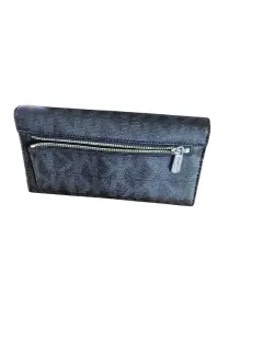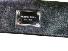Cartera Michael Khors, color neuro con gris oscuro, multiples compartimientos incluyendo cartera para chequera, 7. Compartimientos para tarjetas y 2. para identificaciones, 4. Compartimientos para bulletes y documents, placa de logo de originality, cierre de precion, compartimiento exterior con cierre que 'NO' cierra por favor check el detalle antes de comprar, lo demas en buen estado cosmetico.