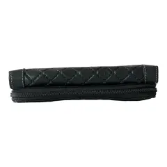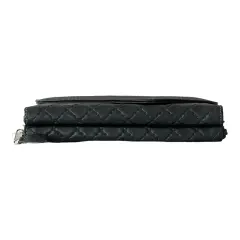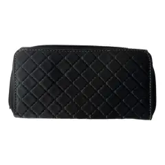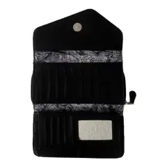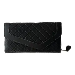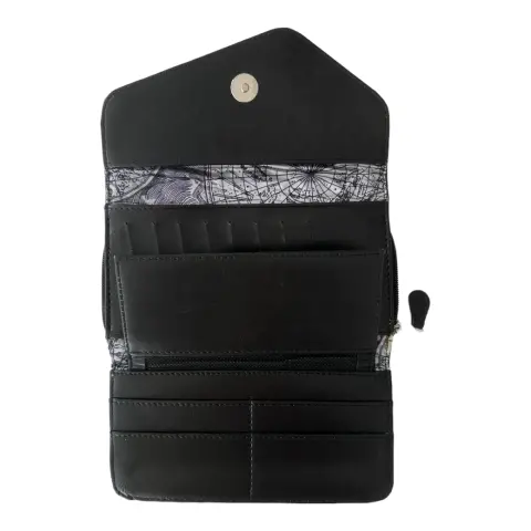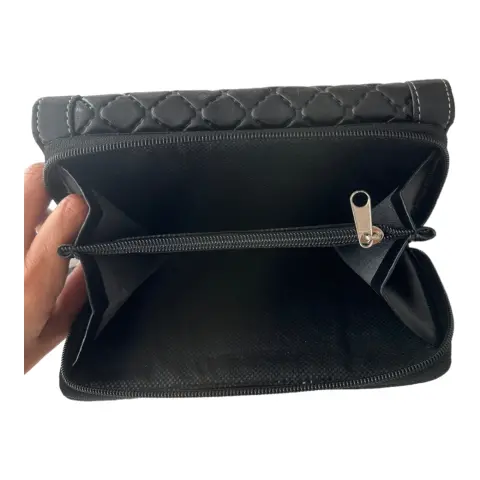 Cartera negra de piel hecha en México un espacio con monedero y cierre y otro con broche con iman, trae espejo.Medidas: 19 cm de largo, 10 cm ancho y 4 cm de grueso.