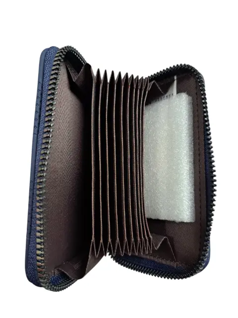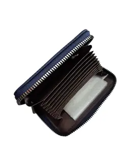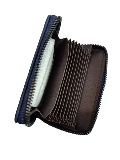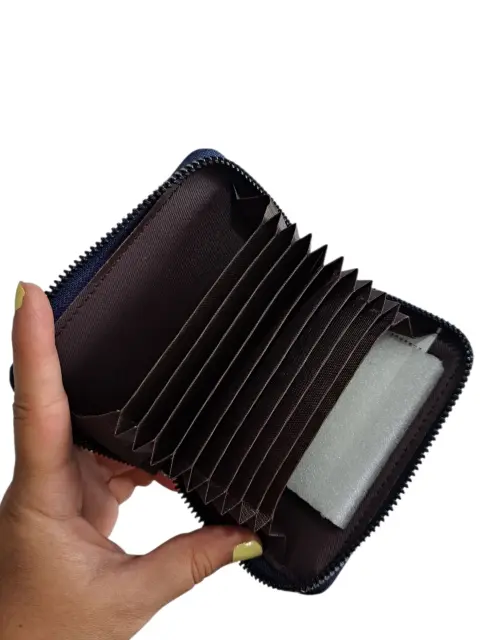 Cartera para tarjetas. Cuenta con 11 compartimentos y le caben más de 20 tarjetas. Medidas: largo 11cm, ancho 8cm, alto 2cm.