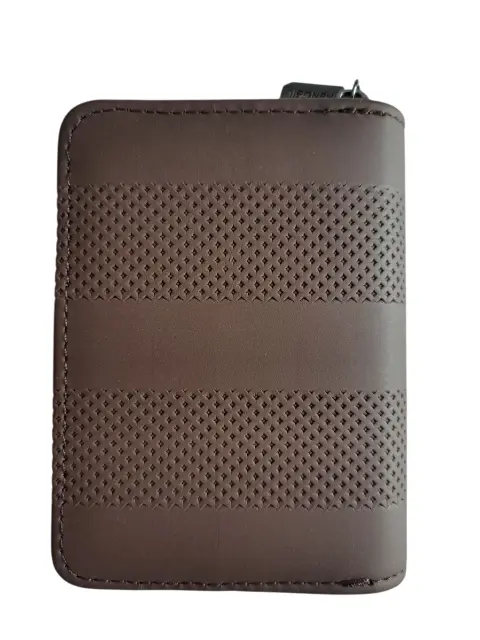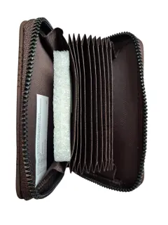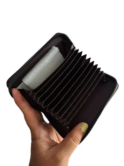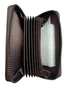 Cartera para tarjetas. Cuenta con 11 compartimentos y le caben más de 20 tarjetas. Medidas: largo 11cm, ancho 8cm, alto 2cm.