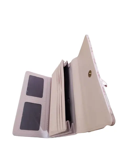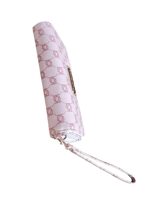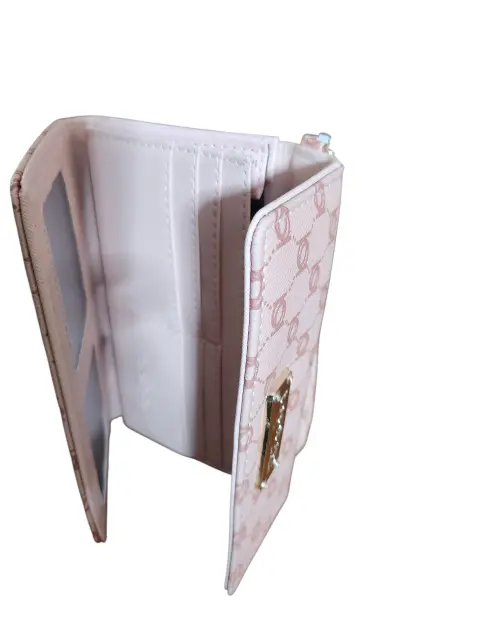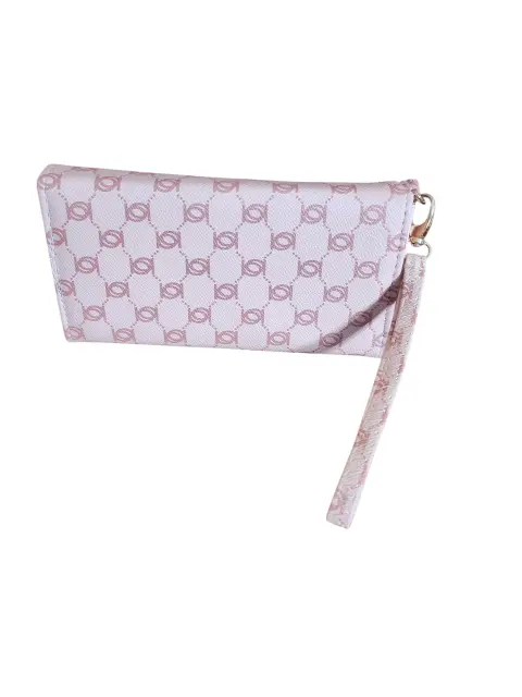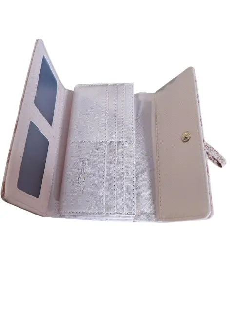 Cartera/monedero Con muńequera Bebe. Cartera de Mano Bebe, color Rosa con graficos, logo de autenticidad, banda muñequera, 3-compartimientos, 2 slots para credentials, bolsa con cierre, 6-slots para tarjetas, cierre de Iman, hecha de Cuervo sinteticos, mide 19cm de anchor, 10cm de largo con 4cm de grueso, y muñequera de 18cm de largo, nueva a estrenar sin etiqueta en buen estado cosmetico.