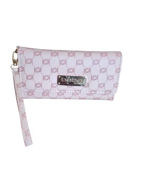Cartera de Mano Bebe, color Rosa con graficos, logo de autenticidad, banda muñequera, 3-compartimientos, 2 slots para credentials, bolsa con cierre, 6-slots para tarjetas, cierre de Iman, hecha de Cuervo sinteticos, mide 19cm de anchor, 10cm de largo con 4cm de grueso, y muñequera de 18cm de largo, nueva a estrenar sin etiqueta en buen estado cosmetico.