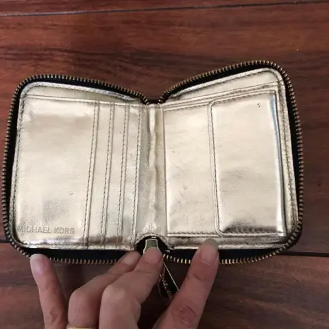 Michael Kors cartera negra charol, interior en dorado, tiene lugar para tajeras, monedero ya lugar para billetes.